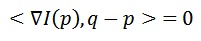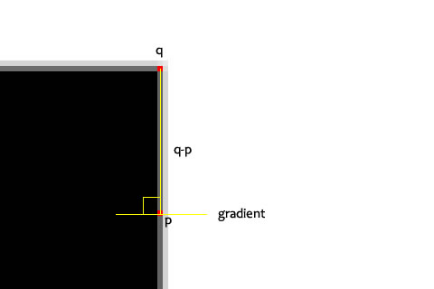 When p lies on an edge, the gradient will be some definite vector (because the pixel values are changing). Also, q-p will be a vector. But in this case, the two will be perpendicular. Here's an illustration: