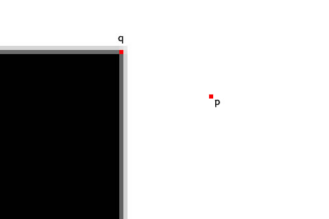 Now, the point q lies very near to the corner. So, p can lie at only one of the following two places: